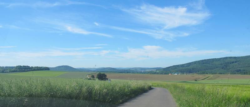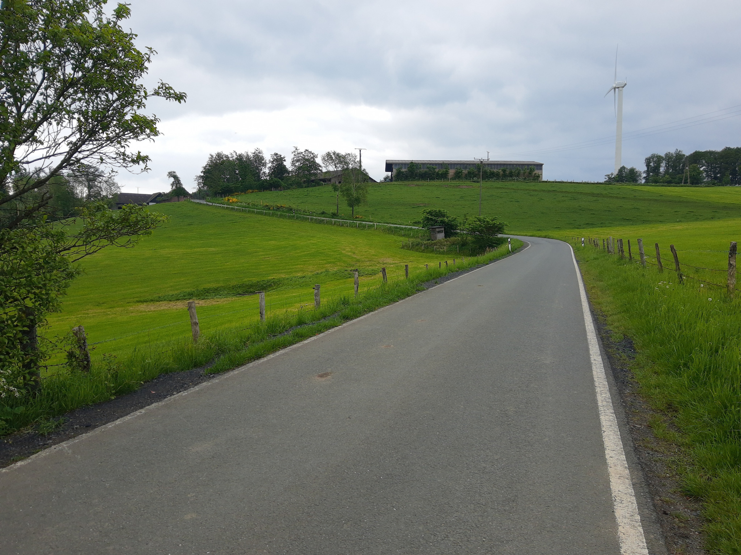 Nach der guten Verpflegung an der Kontrolle kommt dann die Frage an die Beine: 70km oder doch mehr? Wer sich für ersteres entscheidet, fährt am Flugplatz vorbei direkt weiter nach Wickede, wo mal wieder die Ruhr überquert wird. In Wickede beginnt dann der erneute Anstieg hinauf zu den Windenergieanlagen, die bereits vom Ruhrtal aus zu sehen waren. Wer mehr möchte, biegt nach Süden direkt nach Oberoesbern ab und sammelt auf langen Wellen weitere Höhenmeter. Auch wenn die Straße zum zügigen Pedalieren verleitet, es ist Augenmaß angebracht, denn etliche Höhenmeter warten noch. Hinter Oberoesbern wird das Tal gewechselt. Im Biebertal geht es hinab nach Lendringsen. Kurz vor der Hönne wird gewendet und es geht hinauf nach Asbeck. Nachdem der Steinbruch bei Deinstrop umfahren wurde, führt die Strecke wieder bergab. Dabei sollte spätestens klar sein, ob es die 110er oder 150er Runde sein darf, denn in Albringen wartet bereits die letzte Streckenteilung. Die 110er biegt links ab und führt direkt über Wettmarsen hinauf nach Hövel. Die anderen dürfen noch ein paar Meter mehr bergab rollen, ehe sie links in einen kleinen Feldweg einbiegen. Über weite Felder geht es nach Beckum und weiter nach Mellen.