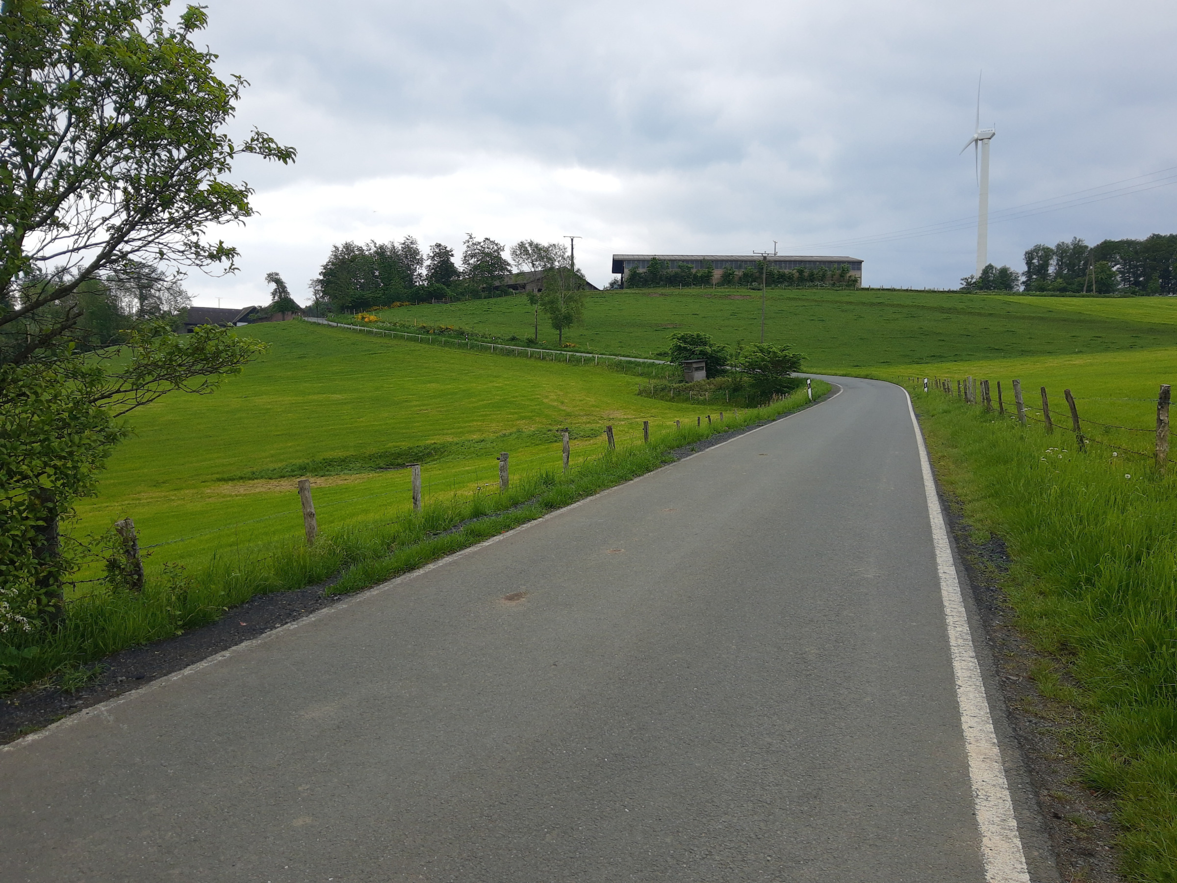 Nach der guten Verpflegung an der Kontrolle kommt dann die Frage an die Beine: 70km oder doch mehr? Wer sich für ersteres entscheidet, fährt am Flugplatz vorbei direkt weiter nach Wickede, wo mal wieder die Ruhr überquert wird. In Wickede beginnt dann der erneute Anstieg hinauf zu den Windenergieanlagen, die bereits vom Ruhrtal aus zu sehen waren. Wer mehr möchte, biegt nach Süden direkt nach Oberoesbern ab und sammelt auf langen Wellen weitere Höhenmeter. Auch wenn die Straße zum zügigen Pedalieren verleitet, es ist Augenmaß angebracht, denn etliche Höhenmeter warten noch. Hinter Oberoesbern wird das Tal gewechselt. Im Biebertal geht es hinab nach Lendringsen. Kurz vor der Hönne wird gewendet und es geht hinauf nach Asbeck. Nachdem der Steinbruch bei Deinstrop umfahren wurde, führt die Strecke wieder bergab. Dabei sollte spätestens klar sein, ob es die 110er oder 150er Runde sein darf, denn in Albringen wartet bereits die letzte Streckenteilung. Die 110er biegt links ab und führt direkt über Wettmarsen hinauf nach Hövel. Die anderen dürfen noch ein paar Meter mehr bergab rollen, ehe sie links in einen kleinen Feldweg einbiegen. Über weite Felder geht es nach Beckum und weiter nach Mellen.
